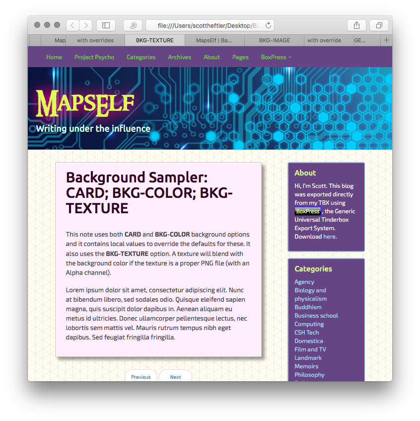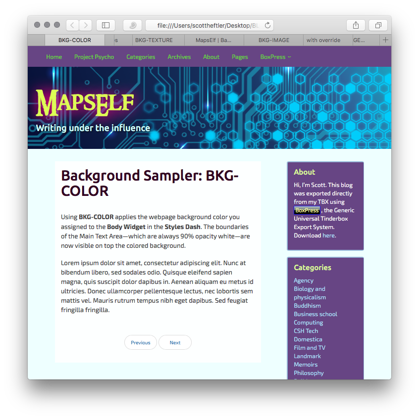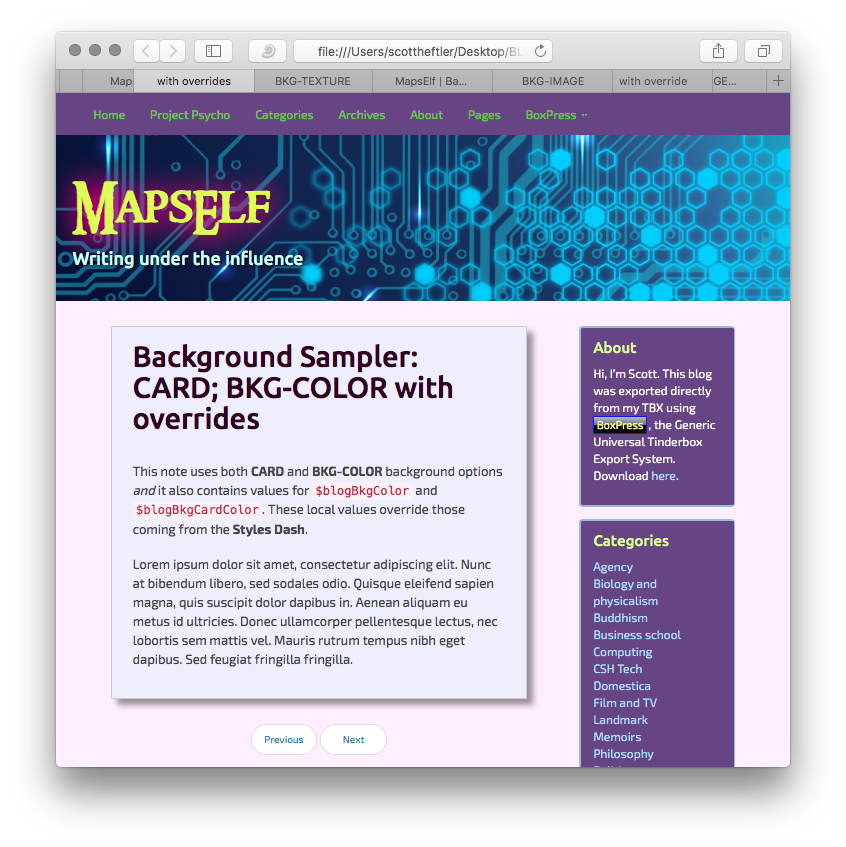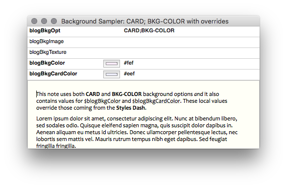 Export using both CARD and BKG-COLOR. But now the Styles Dash webpage and card colors are overridden by the local settings.