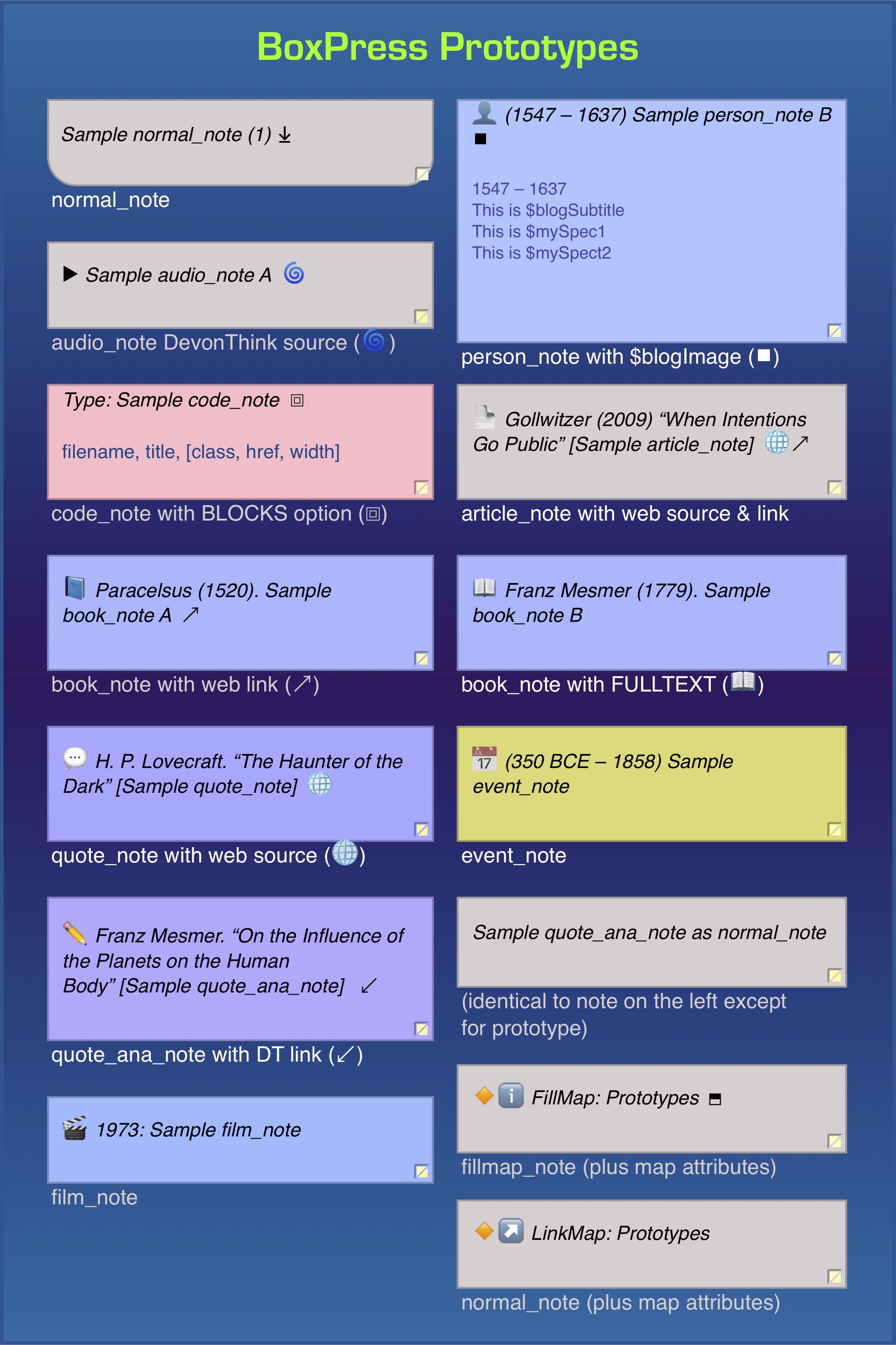 How do the various BoxPress prototypes look when exported together as SmartButtons? This page exports the nine content prototypes one after the other as SmartButtons. These are copies of actual content notes that a have been (comically) renamed to prevent conflict.